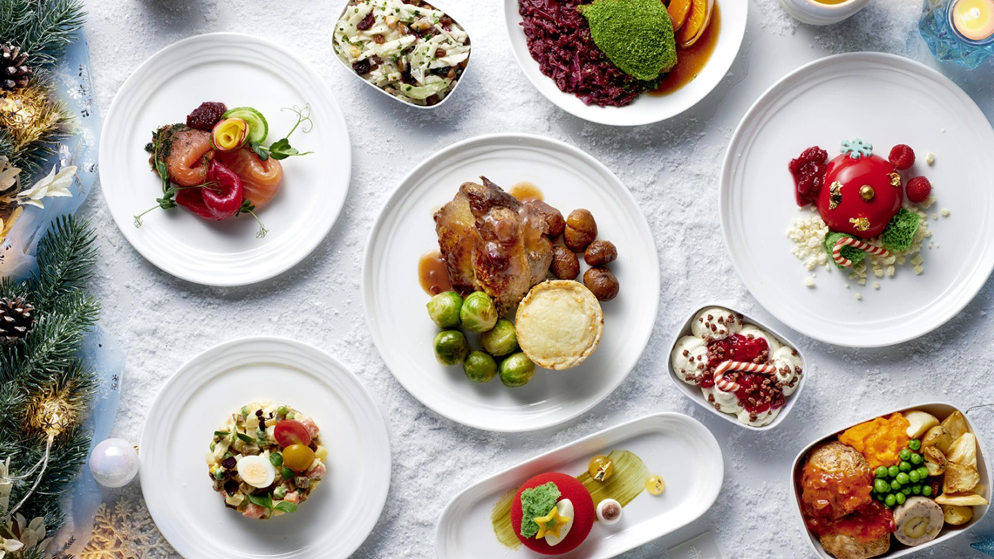 In First, Business and Premium Economy, menus feature dishes such as salmon gravadlax, pickled herring, smoked salmon with crab mayonnaise, and classic roasted turkey with chestnut stuffing and truffle potato gratin.